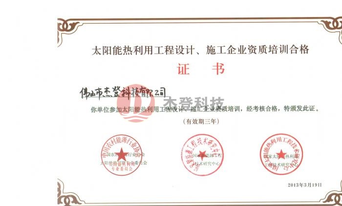 太阳能热利用工程设计、施工企业资质培训合格证书